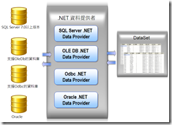 圖是ADO.NET之.NET 資料提供者架構圖,開發人員依據資料來源決定使用何種資料提供者。例如,SQL Server 7.0以上版本的資料來源使用System.Data.SqlClient命名空間下的類別。程式碼列表1,是使用SQL Server .NET Data Provider連到本機的Northwind資料庫存取產品資料表。
